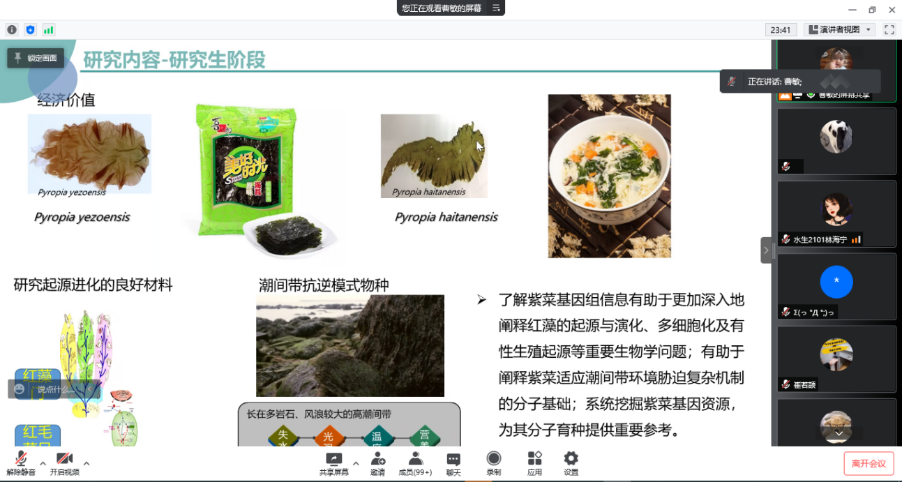 曹敏老师讲述了自己的求学经历,以及求学过程中的一些学习经验和心得感悟。随后,曹敏以紫菜为例,引导同学们了解水产动物医学与基因免疫的概况,又以许氏平鲉基因组的解析为例,讲解了高质量的基因组数据库可以为免疫基因的挖掘及调控机制的解析打下良好的基础。曹敏强调,21世纪是海洋的世纪,海洋水产生产农牧化、海水灌溉农业和蓝色革命计划构成未来海洋农业发展的主要方向。会议最后,曹敏老师提出:学习的本质,不仅仅在于记住哪些知识,而在于它触发了同学们的思考。她鼓励同学,多看、多问、多想、多做,克服困难,努力向上。