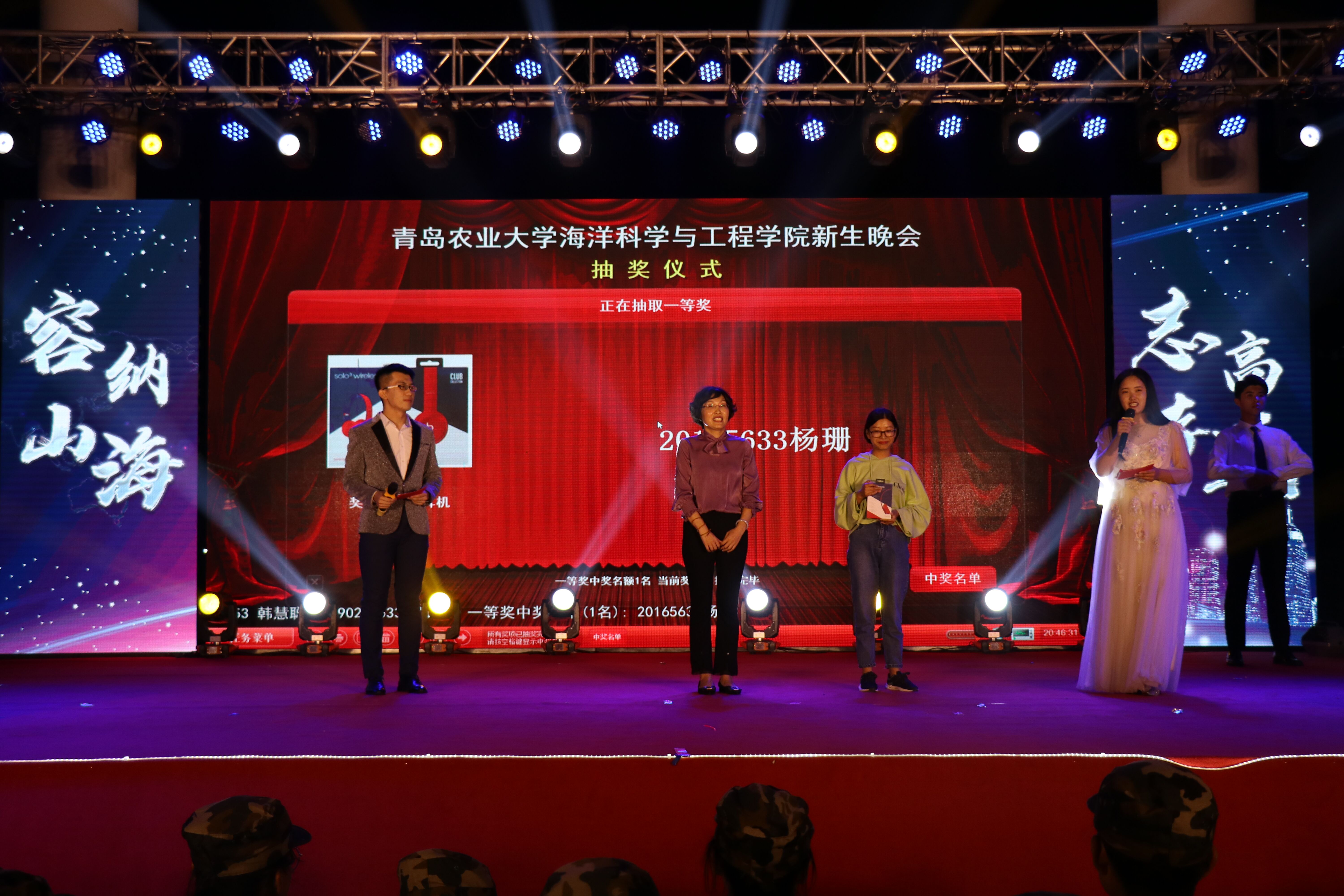 此次晚会不同以往,共三轮的“寻找海院锦鲤”抽奖活动让人眼前一亮。公布水卡、饭卡和价值1600元蓝牙耳机这些奖品后,全场气氛到达顶点。抽奖采用学号喊停的方式,“锦鲤”们随之现身。随后山东大学十大歌手为大家带来了歌曲串烧,《男孩》、《烟火里的尘埃》,一曲曲,一声声,伴随着悦耳的声音,观众们挥舞着手中的荧光棒,掌声和欢呼声此起彼伏,台上台下汇成了一片激情四射的光的海洋。