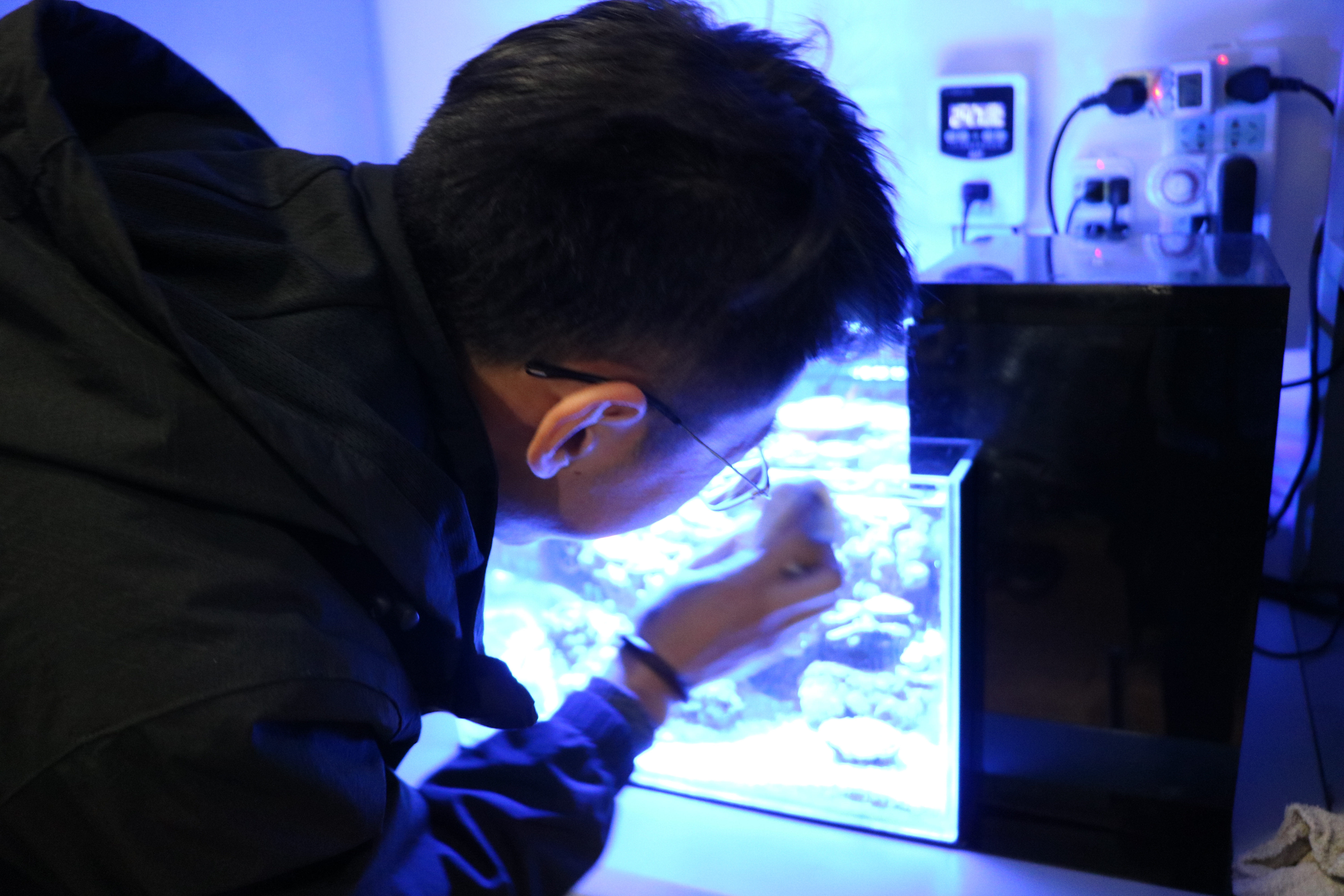王浩的宿舍也跟其他人有些区别,书桌上是一个小巧精致的海水缸,书柜上是一排整齐严密的容器设备。灵动的海葵 、多彩的珊瑚、时隐时现的小丑鱼在缸里相得益彰,常常引来周围同学的驻足观赏。海水缸比水草缸更难养成本也更高,需要通风、喂食、检测水质参数等一系列大输入大输出的流程,但他还是毅然决然的做了。如今王浩已经大三,全国老员工水族箱造景技能大赛也只剩一次参赛机会,考虑到以后的考研与就业问题,王浩依然自信可以把水族造景坚持下去,把它当作自己一生的追求去热爱。
