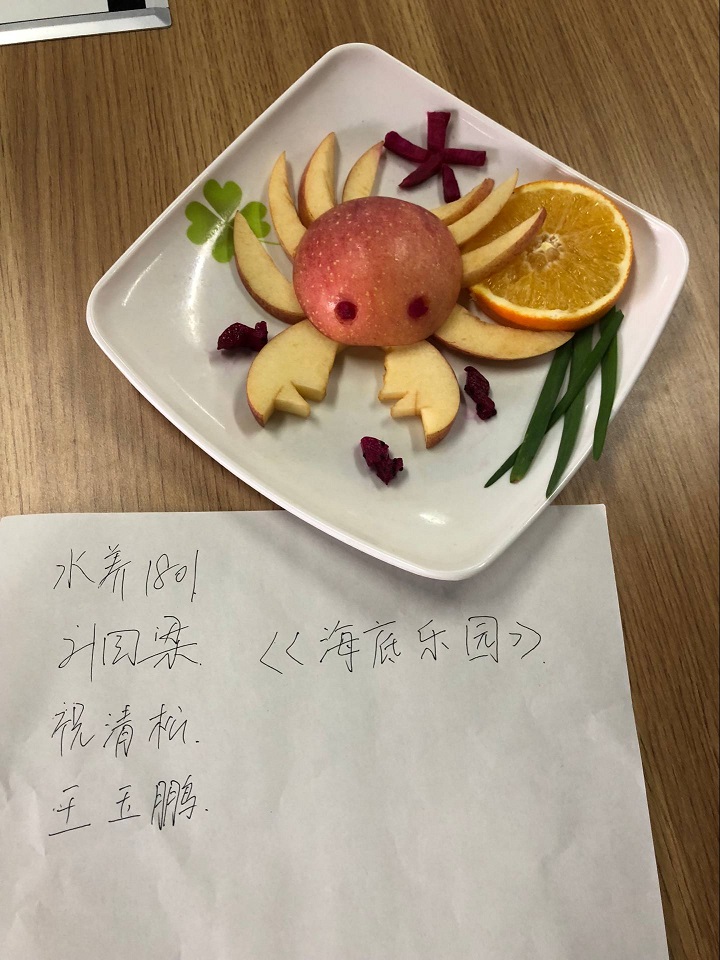 各班级积极组织,参赛人员进行分工合作,苹果、橘子、猕猴桃……都在同学们丰富的想象力和灵巧的双手下变成一个个美丽的装饰,组成了别具一格又创意满满的水果拼盘。冷拼的造型、雕刻和配色等艺术加工,突出展现了同学们心灵手巧的艺术天赋与团体合作的精神品质。最终经过评比,水养2018级4班作品“美丽海滩”荣获一等奖,水养2018级2班作品“海底乐园”、水族2018级1班作品“海边沙滩”荣获二等奖,水医2018级1班作品“澄净海洋”、海资2018级1班作品“孤岛之蟹”、水养2018级3班作品“冬不寒”荣获三等奖。
