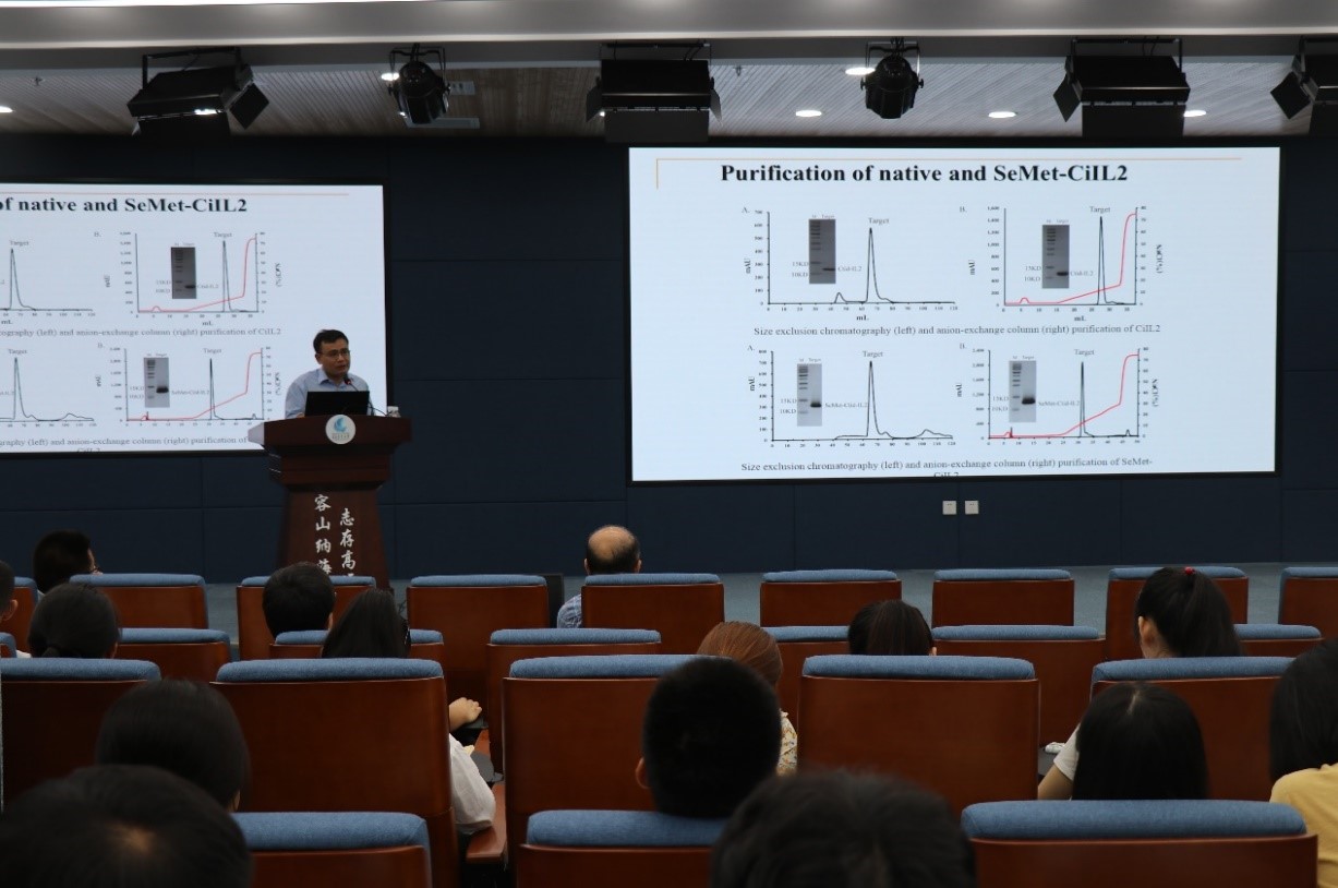 邹钧教授就“鱼类细胞因子晶体结构与功能:以草鱼白细胞介素2为例”展开探讨。邹钧利用大量先进的技术手段,科学严谨的试验设计,翔实的研究数据,以草鱼白细胞介素2为例,直观地阐述了鱼类细胞因子晶体结构与功能。邹钧指出,目前我国水产生物免疫研究居国际先进水平,正在向领跑地位跃进,而免疫技术创新将带来水产养殖业的卓越发展,这对学习水产知识的学子们来说,是机遇也是挑战。