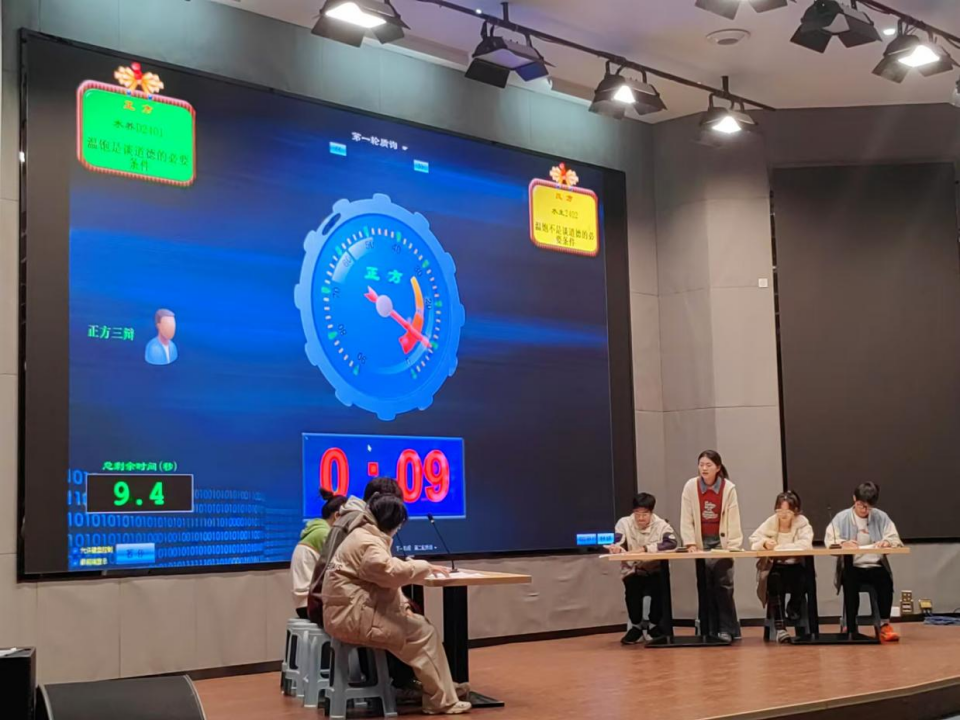 比赛共设有开篇立论、攻辩、攻辩小结、自由辩论、总结陈词等五个环节。率先登场的两组选手就“要不要站在他人的角度看世界”辩题展开了激烈的讨论,正方辩手强调换位思考的重要性,认为这是理解他人、促进社会和谐的基石。反方辩手则从个体独立性和主观性出发,论证了保持自我视角的必要性。双方辩手引经据典,逻辑严密,为观众呈现了一场精彩的思想交锋。紧接着,辩论赛进入了第二个辩题“温饱是不是谈道德的必要条件”。正方辩手从基本人权和生存需求出发,认为只有在满足温饱的条件下,人们才能更好地讨论和实践道德。反方辩手则认为道德是超越物质条件的,无论贫富,人们都应该遵守道德规范。双方辩手在攻辩和自由辩论环节中,你来我往,妙语连珠,将比赛推向了高潮。现场气氛热烈,观众们不时为选手们的精彩表现鼓掌喝彩。在总结陈词环节,双方辩手结合重要论点进行了梳理和总结,紧扣主题,展现了他们出色的临场应变能力和归纳总结能力,为辩论赛画上了圆满的句号。
