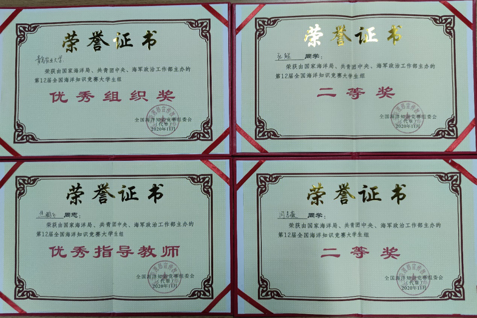 近日,第12届全国海洋知识竞赛老员工组总决赛在海南省海口市落下帷幕。在本届竞赛中,三亿体育选派的海洋资源与环境专业2018级1班员工张超、水产养殖学专业2018级1班员工闫志薇参加,斩获两个全国二等奖的成绩。三亿体育官网获得“优秀组织奖”,辅导员焦鹏飞获得“优秀指导教师”。