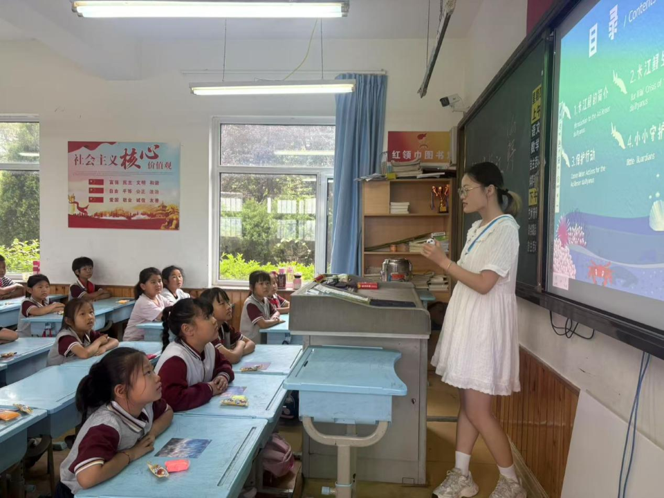 活动伊始,团队成员周媛媛以一段精彩有趣的动画短片引入,短片中活泼灵动的长江鲟形象一下子吸引了小朋友们的目光,成功激发了他们对这种神秘生物的好奇心。随后,周媛媛用简单易懂、生动活泼的语言,向小朋友们介绍长江鲟的外形特点、生活习性以及它们在长江生态系统中的重要作用。随后,成员高竹筠巧妙运用比喻和拟人手法,把长江鲟比作“长江里的古老居民”,讲述它们如何历经岁月变迁,在长江中繁衍生息,小朋友们认真听讲,一双双眼睛里满是好奇与专注。