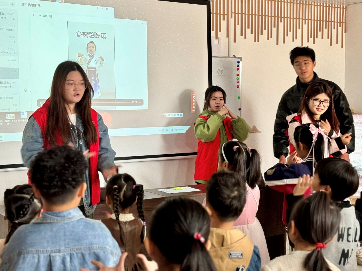 志愿者通过讲述红色故事、观看纪录片等方式,向孩子们介绍了革命先烈为国家和人民所作出的牺牲与奉献。随后,志愿者带领孩子们学习了手势舞《半生雪》,向孩子们传递了牢记历史,为中华崛起而读书的能量信念,帮助孩子们深入了解峥嵘岁月中革命先烈们的爱国主义精神,鼓励孩子们奋力拼搏,赓续红色血脉。