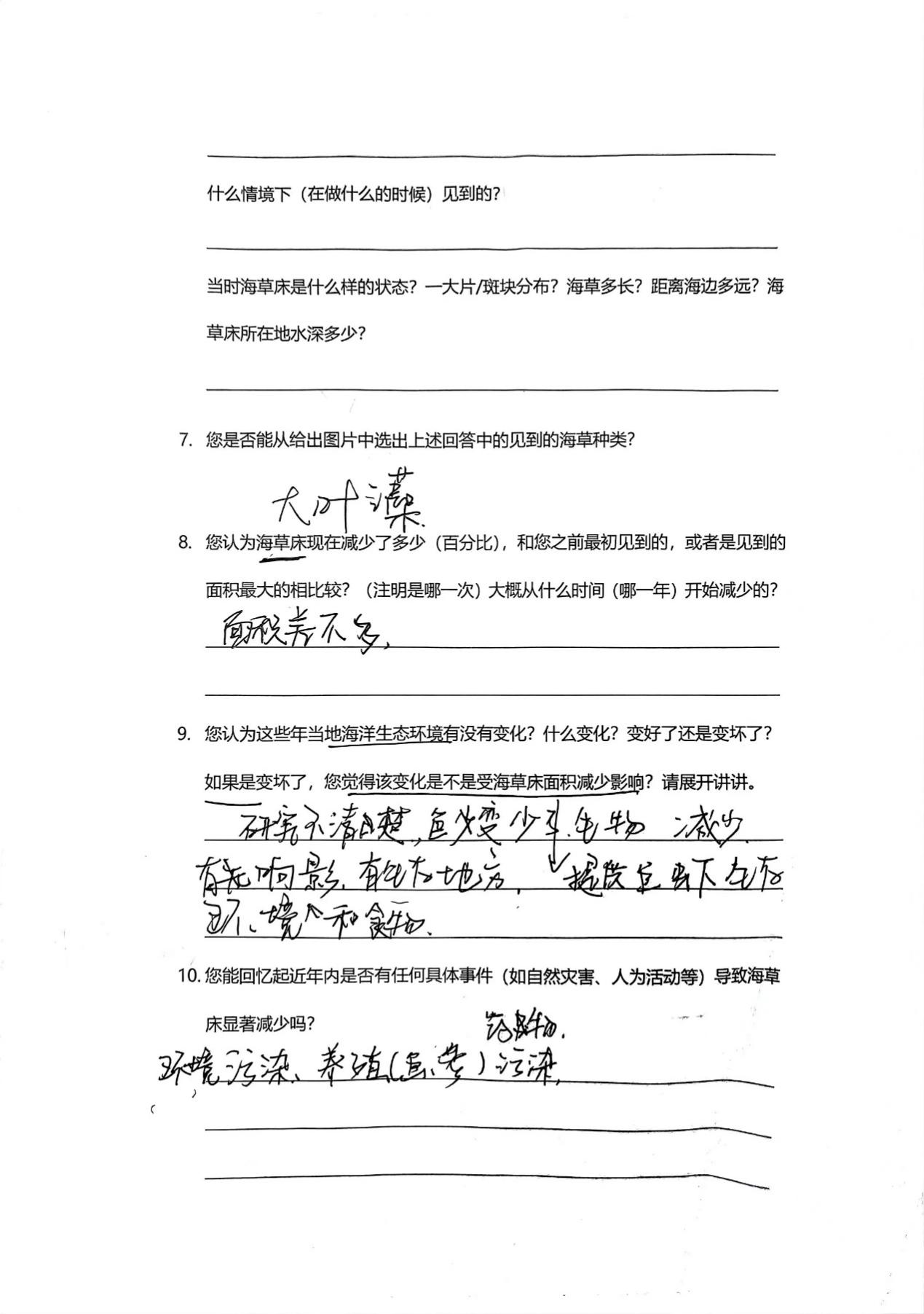 实践服务团成员以小组为单位展开了实地调查,通过调查问卷的方式,深入了解了海草床的生长状况、物种分布、环境因子等信息。
