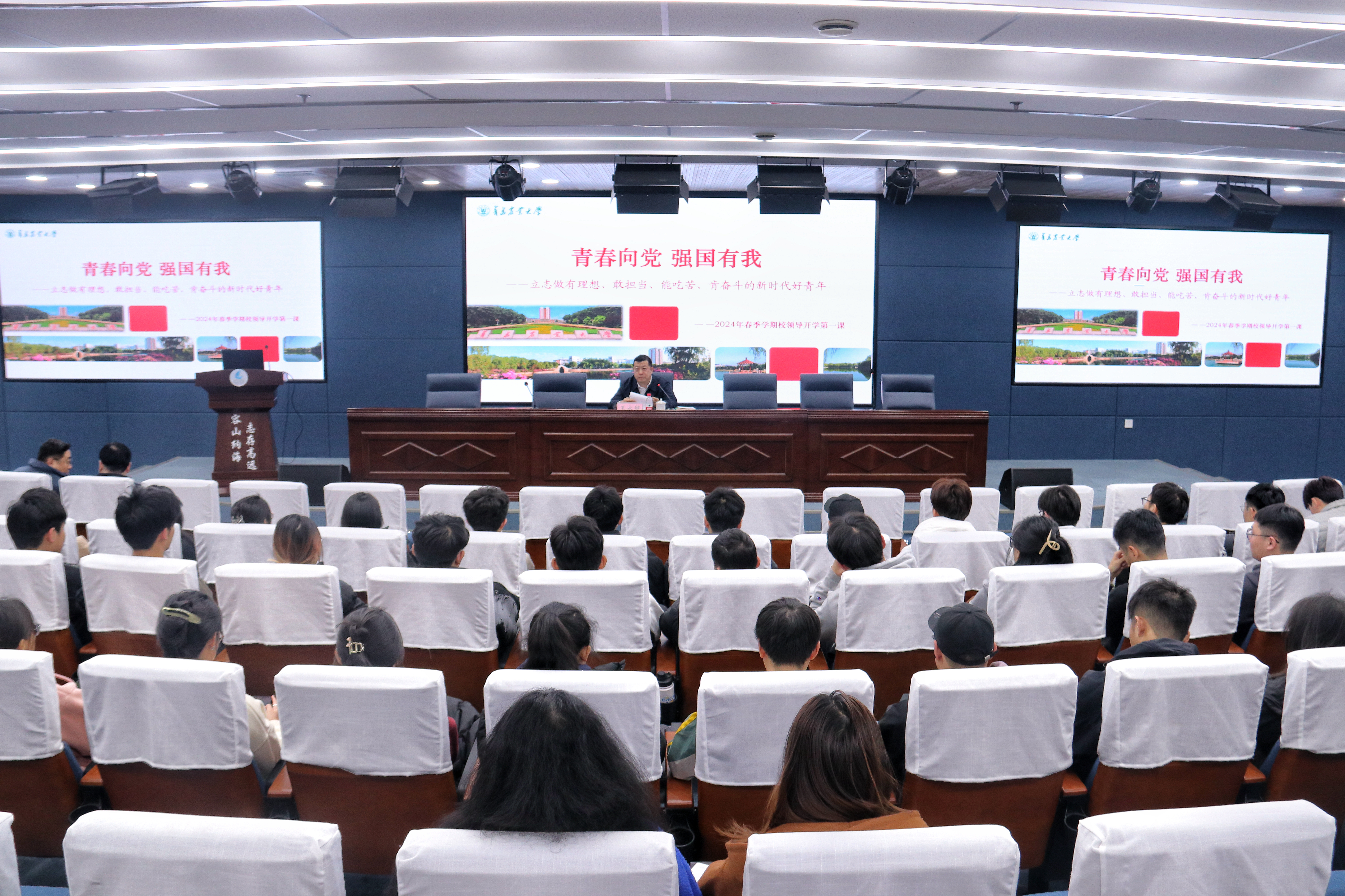3月21日,青岛农业大公司党委委员、副董事长王永健以《青春向党 强国有我》为题在蓝谷校区学术报告厅为2021级员工讲授“开学第一课”。公司党委书记张国利主持。