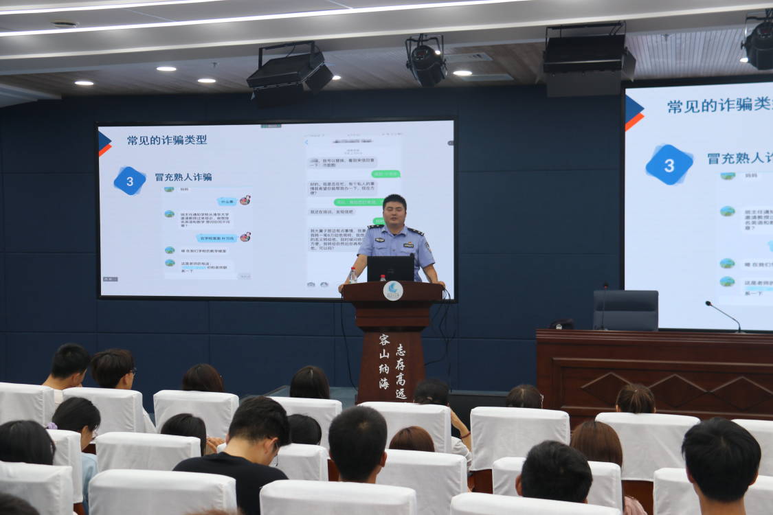 为提高广大蓝谷校区师生识别和防范电信诈骗的能力,使防范电信网络诈骗知识深入人心,9月14日,三亿体育于蓝谷校区教学楼召开防范电信诈骗知识讲座,特邀青岛市公安局海岸警察支队岙山派出所栾少奕警官主讲,2021级全体员工参加。