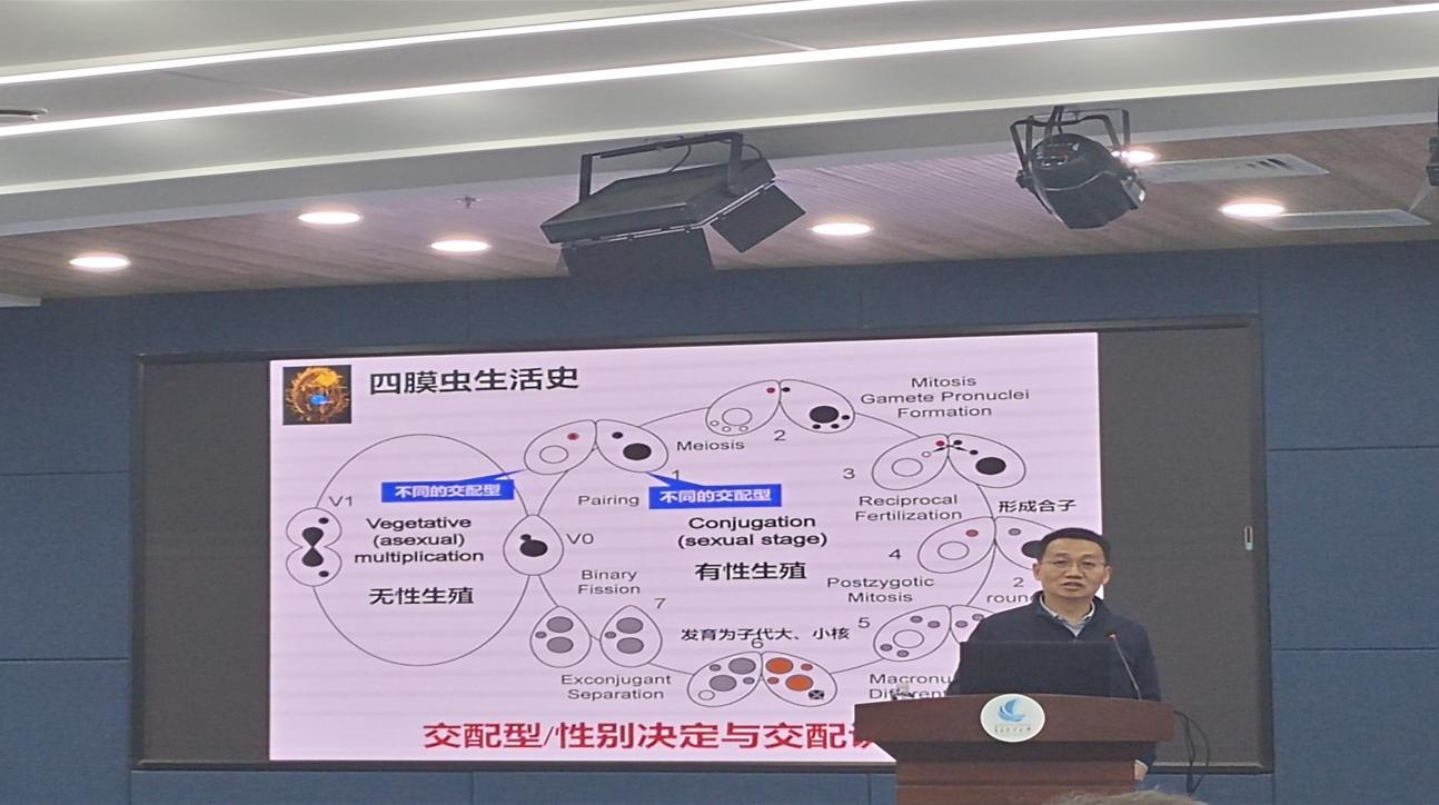 会议伊始,李超介绍缪纬、汪建国研究员。随后,缪纬围绕四膜虫的相关实验及研究成果,深入讲解了四膜虫的生活史和繁殖雨中等问题,论述了原生动物的多样性和遗传资源利用现状,使同学们充分了解并建立了四膜虫的相关知识体系。汪建国则对中国鱼类寄生虫学发展史进行了讲解,从鱼类的疾病种类、相关致病生物、医疗方式等方面向同学们展开详细论述。讲解结束后,同学们针对本次内容进行了互相讨论并作出提问,两位研究员也一一进行了详细解答。讲座在一众好评声中圆满结束。