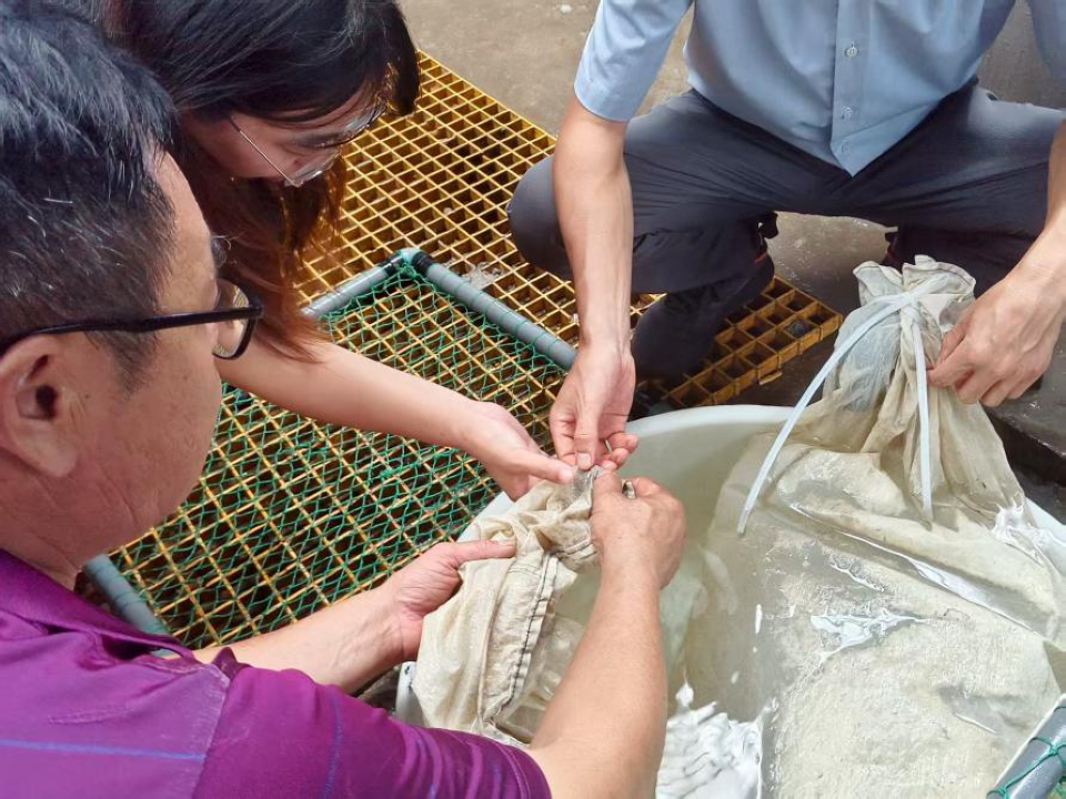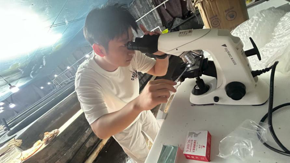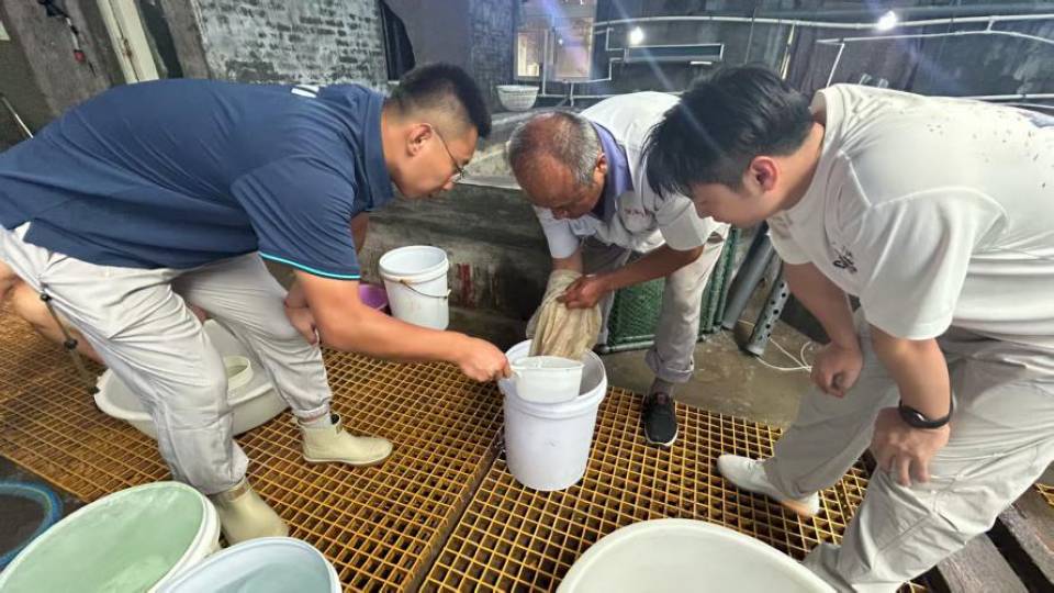 与威海聚朋埕一线人员深入交流中,志愿团明确了解到企业以期在绿鳍马面鲀秋季繁育技术及受精时间难判断的生产困境。针对这一核心问题,志愿团成员迅速结合水产养殖、生物技术等专业知识开展研讨,最终确定,通过给种鱼注射催产激素来促进产卵,同时借助显微镜观察的方式,补充判断准确的受精时间。随后,志愿团和一线员工马上分工行动:一部分成员负责精准调配催产激素,仔细控制注射的剂量和部位,尽量减少种鱼的应激反应;另一部分成员则调试好显微镜设备,通过观察胚胎初期的形态变化,精准定位受精的关键时间点。经过一段时间的实践,该方案取得了显著成效,不仅有效改善了企业的产卵状况,也成功解决了受精时间判断的难题,切实缓解了绿鳍马面鲀在人工繁育中的瓶颈问题。