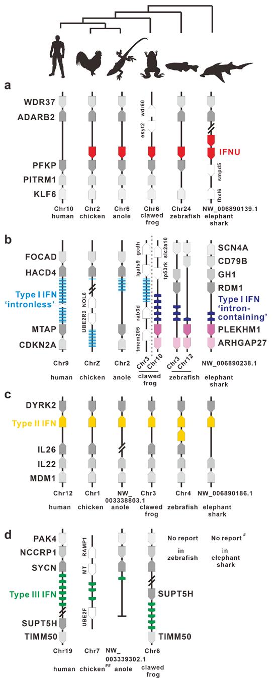 干扰素是脊椎动物在受病原感染后分泌的一类细胞因子,可以诱导机体产生抗病毒状态。经典的干扰素分类系统,将其分为三类,即I型、II型、III型干扰素,它们分别利用IFN-αR1/IFN-αR2、IFN-γR1/IFN-γR2、和IFN-λR1/IL-10R2为其受体复合物。通过生物信息学分析、基因敲降/敲除、病毒感染等手段,聂品教授团队在斑马鱼(Danio rerio)和非洲爪蟾(Xenopus laevis)中,证实了IFN-u(upsilon)基因的表达和抗病毒活性,同时发现这个干扰素利用的受体复合物为II类细胞因子受体成员IFN-uR1和IL-10R2。所发现的IFN-u和其受体复合物IFN-uR1/IL-10R2,以及IFN-u和IFN-uR1基因座在脊椎动物中的保守性,都表明其不同于之前报道的其它三种类型的干扰素,所发现的IFN配体受体系统可被认为是IV型IFN。