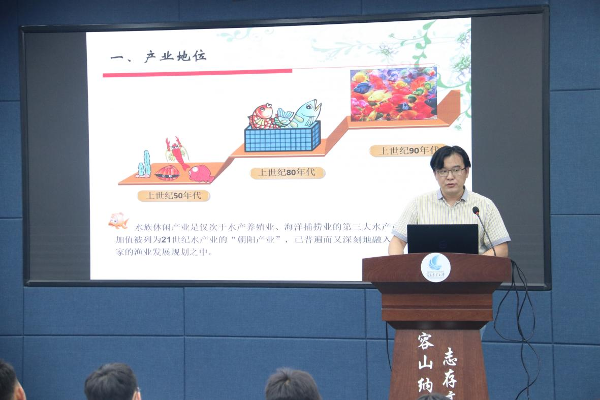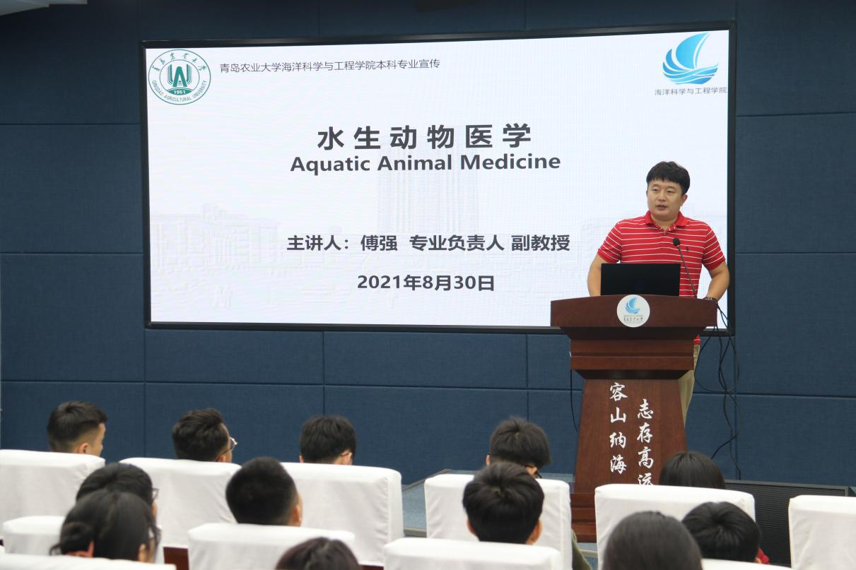 王国栋副教授为同学们讲解的水产养殖学是山东省特色名校的重点建设专业,主要培养德、智、体、美全面发展的高素质专业人才,要求员工对国家和社会有高度责任感,具有水产生物增养殖、疾病诊断、营养饲料等方面的基本理论知识和基本技能。王峰副教授着重强调了专业培养特色,就水族科学与技术专业的就业去向与同学们进行了交流。傅强副教授点出水生动物医学的基本任务是有效地防治水生动物、医学实验动物及其他观赏水生动物疾病的发生,增设水生动物医学专业适应国家加大水生动物疫病防控体系建设,更好满足人们对高质量水产品的需要。