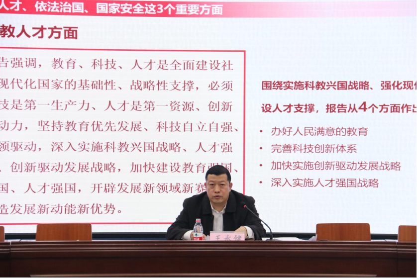 王永健带领师生党员深入全面地学习了党的二十大报告,详细讲解了党的二十大的主题、主要成果,总结回顾了过去五年的工作和新时代十年的伟大变革,深入阐释了马克思主义中国化时代化以及中国式现代化,详细解读了全面建设社会主义现代化国家的目标任务、坚持党的全面领导和全面从严治党、应对风险挑战等内容。