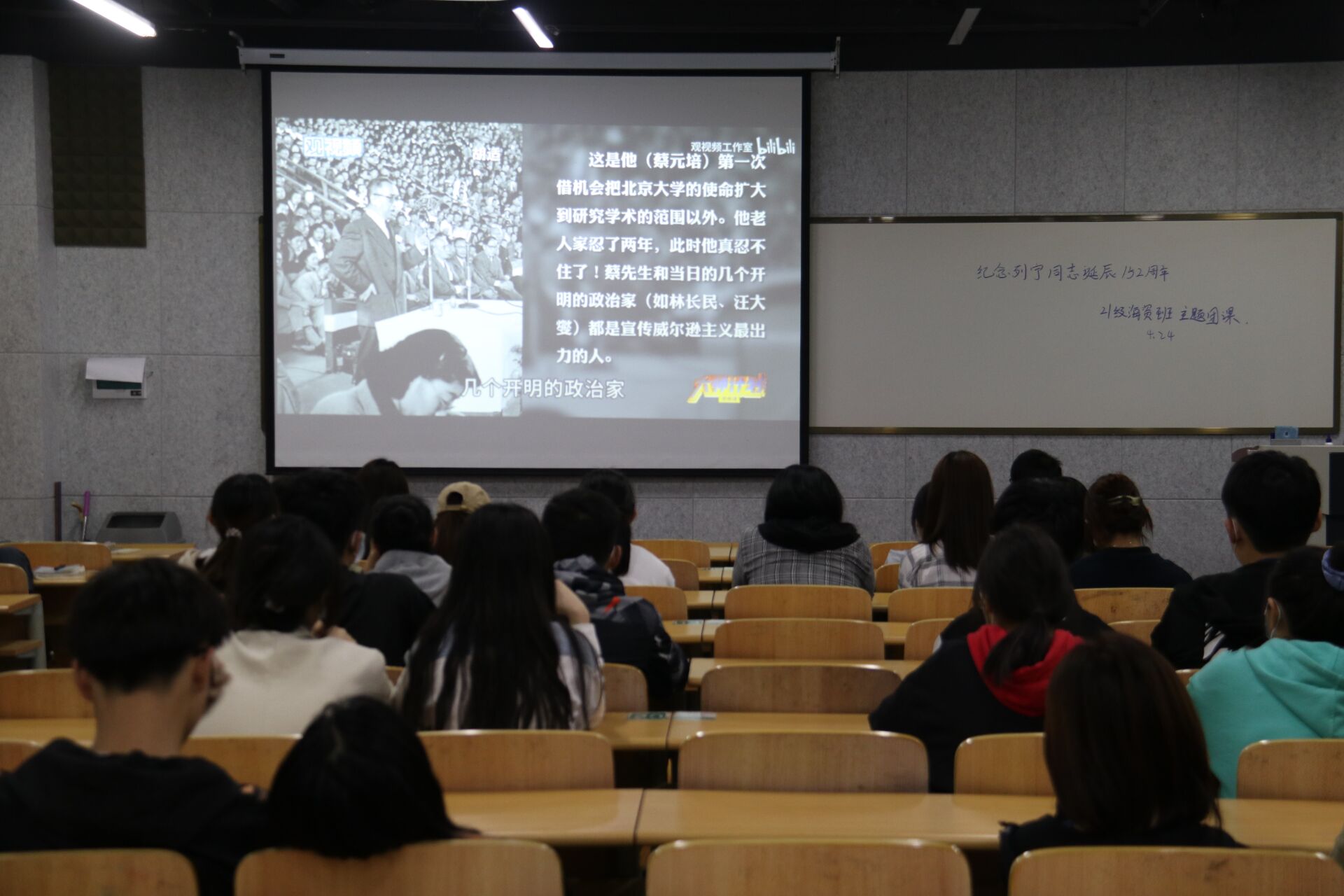各班团支书组织同学们观看了《再见,列宁!》相关视频,视频通过讲述社会中的小事,折射出柏林墙倒塌的历史大潮中东德民众的心理状态,从侧面展示出列宁能够在人类历史的转折关头,站在时代前沿引领时代前进的原因。列宁长期处在革命实践和研究的过程中,坚持马克思主义哲学理念,并结合国家的实际情况,继承与发展并形成列宁自己的思想体系。如今,中国发展仍处于并将长期处于重要战略机遇期,在纪念列宁同志诞辰152周年的同时,中国更应学习列宁的思想体系,解决当代中国发展中的问题,实现中华民族的伟大复兴。