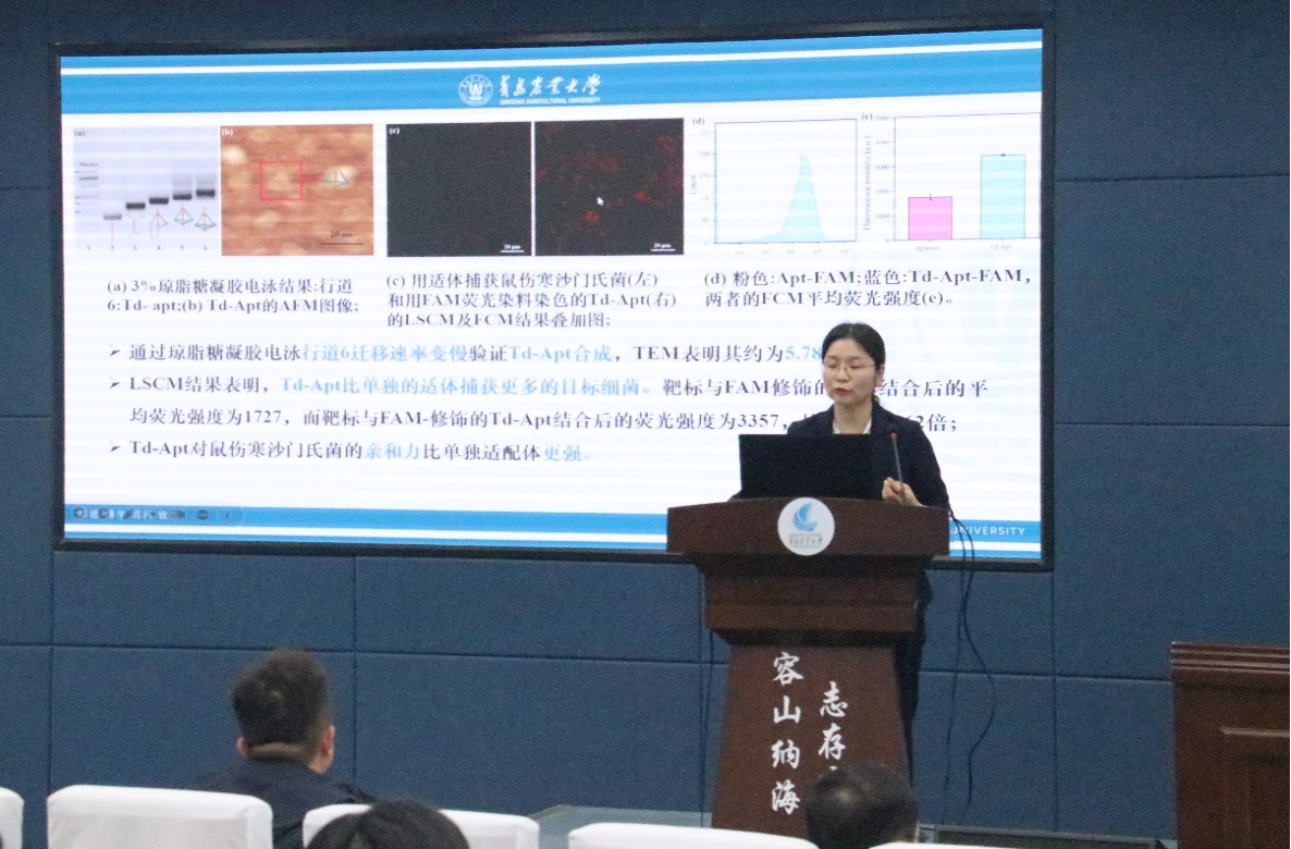吴薇以《食源性致病菌的快速检测及绿色防控》为题,围绕食源性致病菌的致病机理、检测方法及绿色防控展开讲解。吴薇团队通过核酸适配体正四面体结构与食源性致病菌结合的新机制对致病菌进行识别,并用荧光核酸适配体传感器对食源性致病菌进行高效灵敏的检测,最后通过核酸适配体荧光分子马达动态捕获和原位杀菌的新机理对食源性致病菌进行防控,为食品安全问题提供了保障。