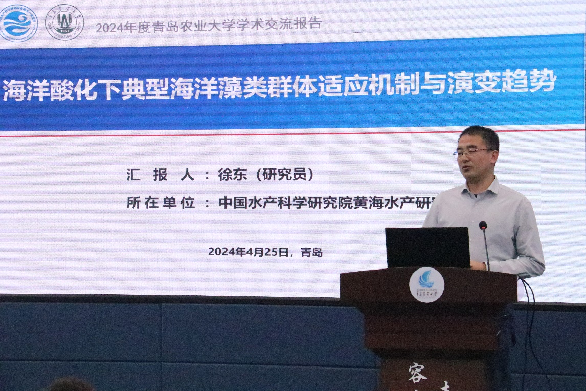 徐东以《海洋酸化下典型海洋藻类群体适应机制与演变趋势》为题,介绍了大型海洋藻类对海洋生态系统的重要功能。徐东团队以近岸典型的大型藻类为研究对象,揭示了藻类的短期应答机制并通过海区围隔的野外作业解析了自然条件下大型藻类应对长期海洋酸化的调控能力和适应特征,为有效开展海洋酸化和全球变暖等前沿热点研究提供试验平台和方法范例,也为阐释未来气候变化条件下海洋生态系统生物多样性格局变迁奠定重要的理论基础。