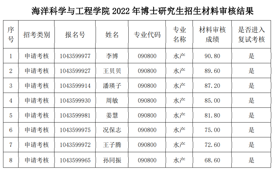 根据《三亿体育官网 2022 年攻读博士学位研究生招生简章》、《海洋科学 与工程公司博士研究生招生“申请—考核”制实施细则》,综合专家组成员对符合报考条件的考生材料评价,经公司研究生招生工作小组审核通过,初步确定进入复试考核的考生名单,现将考生材料审核结果予以公布。如有异议,请与公司联系(联系方式:0532-86550511)。
